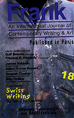 Frank An International Journal of Contemporary Writing and Art. Founded in 1983 by writer/editor David Applefield, Frank is a book-length periodical that has published in the past such literary bigwigs as Henri Michaux, Charles Bukowski and William Styron, alongside emerging authors, plus impressive interviews and foreign dossiers highlighting translated prose and poetry from around the world. 32 rue Edouard Vaillant 93100 Montreuil, tel: 01 48 59 66 58, email: Editor@ReadFrank.com, website: http://www.readfrank.com