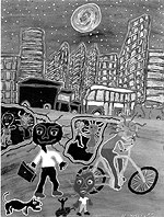 In contrast, Harry Wedges vibrant, childish, narrative paintings are accompanied by barely literate personal stories that nevertheless grab the viewer by the hand, guiding his thoughts and feelings. Although this sometimes reduces the work to illustrative kitsch, like most kitsch, its fun, colorful and engaging. He uses Western artistic techniques, incorporating traditional Wiradjuri imagery to make comments on a broad range of issues that concern aboriginal people today, particularly koories (alienated, urbanized aborigines): their culture, AIDS, domestic and sexual violence, environmental degradation, drugs, identity...